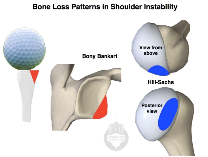A Bony Bankart equates to a chipped golf tee, so your humeral head has less of a platform on which to rest. This may happen as an acute fracture, or, with several dislocations, you may suffer gradual erosion of the front-lower portion of your socket.