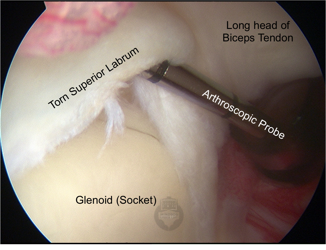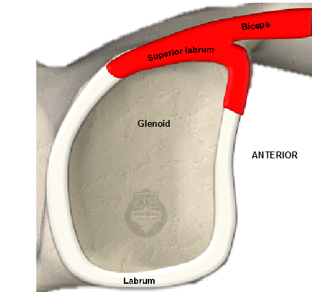 The superior labrum is the upper portion of the cartilage rim that attaches to the edge of your shoulder socket (glenoid. This upper part of the socket and labrum is also the attachment for the long head of biceps tendon. Occasionally a SLAP tear extends into the biceps tendon itself. The term SLAP means - Superior Labrum Anterior and Posterior to biceps. The area marked in red below is the SLAP region. The arthroscopic photograph below shows an unstable SLAP tear.