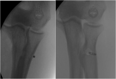 These images show Intra-operative x-rays of the deployed biceps button with the tendon docked in the radial tuberosity