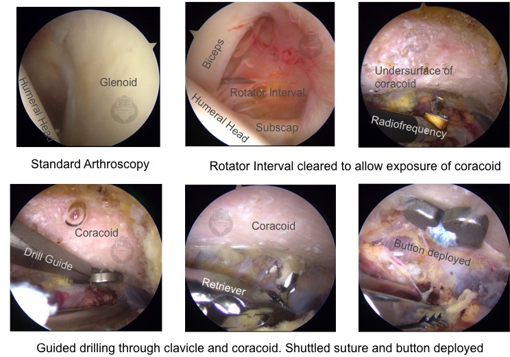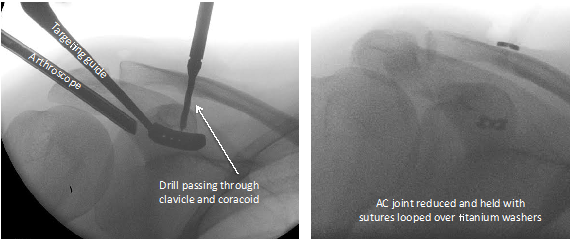 This is a keyhole operation. Three tiny holes allow access to the joint and a separate 2cm mini-open incision over is made over your collar bone to complete the fixation. Strong fibre-tapes are passed through a small drill hole in your collar bone and the coracoid process of your shoulder blade. The sutures are looped and tightened over small titanium buttons which pull the collarbone down to its correct position. This suture material holds your AC joint in place while the injured coraco-clavicular ligaments heal. The x-ray images below show the drill passing through the collar bone and coracoid and the completed repair. The surgical photographs show the main steps of the procedure. The last of these images shows the titanium washer securing the fibre-tape loops beneath the coracoid.