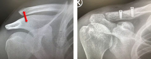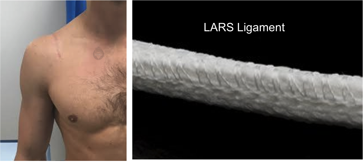 A pre-op and post-op image of a grade 5 AC separation reconstructed with LARS ligament.