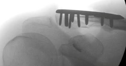 Lateral clavicle plate with ligament repair augmentation (note the button beneath the coracoid process of the shoulder blade). This holds sutures which are helping to hold down the plate on the bone.